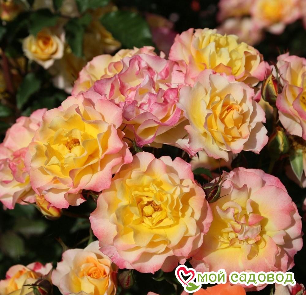 Роза ЛандЛуст Популярный среди садоводов сорт выведен в 2014 году в Германии. Он удостоен нескольких мировых наград: приз зрительских симпатий (Италия, конкурс Монца), первый приз международного жюри (Франция, конкурс роз Лион), звание «Золотая Роза» (Бельгия, конкурс роз Кортрейк) и т. д. Купить эту рассаду стремится практически каждый розовод. Ботаническое описание Высота взрослого саженца варьирует в пределах 1,1 – 1,3 м. Диаметр куста равен 80 см. Бутоны абрикосово-жёлтые, с нежным розовым оттенком. По краям лепестки с малиновой окантовкой. По мере распускания они приобретают тёмно-розовый цвет. Полностью раскрывшийся цветок махровый, диаметром 7 – 9 см, розетковидный, состоящий из 19 – 26 лепестков. Он не источает никакого аромата. Листва кожистая, тёмно-зелёная. Побеги длинные, аркообразные. Применение Как и все шрабы сорт ЛандЛуст хорошо смотрится в любом виде: в сольных посадках, в группе из 3 – 5 кустиков и в цветниках, состоящих преимущественно из почвопокровных роз. Посредством неприхотливого растения можно создавать оригинальные клумбы, закрывать заборы и ограждения, декорировать небольшие уголки сада. Агротехника Уход за шрабом ЛандЛуст практически не отличается от ухода за остальными классами роз. Молодую рассаду нужно вовремя поливать, при необходимости подкармливать и проводить профилактическое опрыскивание листвы. Последний пункт меньше всего требует внимания, поскольку сорт устойчив ко многим грибковым инфекциям. Для поддержания повторяющегося цветения и аккуратной формы саженцы необходимо правильно подстригать. В целом эти розы неприхотливы и довольно выносливы, благодаря чему с их выращиванием справится даже новичок в садоводстве. Весной требуется вовремя убирать сорные травы в приствольных кругах. Дело в том, что после их разрастания затрудняется доступ кислорода к корневой системе. Об этом важно помнить, если хочется получить здоровое растение с высокими декоративными качествами. В период засухи рассаду надо обильно поливать, чтобы она благополучно развивалась и максимально долго цвела. Из-за недостатка влаги кустики будут отставать в росте, а бутоны будут миниатюрными и в малом количестве. Под каждый экземпляр рекомендуется выливать по 1 ведру тёплой воды. При этом жидкость не должна попадать на стебли и листья – это создаст благоприятную среду для развития грибковых болезней. Роза ЛандЛуст не любит жары. Оптимальная температура для её роста и развития – +20 – +22 ˚С. Если столбик термометра поднимается выше +25 ˚С, это вызовет стресс у молодой рассады. В таких условиях нужно следить, чтобы грунт вокруг растений не пересыхал. Для этого прикорневую зону укрывают слоем мульчи. Она сохранит ценную влагу, и защитит корневище от перегревания. Следовательно, все метаболические процессы будут протекать с правильной интенсивностью. Неотъемлемой частью жизненного цикла являются подкормки. Они помогают саженцам окрепнуть, красиво зацвести, благополучно пережить зимние заморозки и противостоять естественным врагам. В первый раз кустики удобряют азотными препаратами. Также в весенний период используют калийно-азотные составы — они стимулируют формирование зелёной массы и бутонов. Вносят подкормки не чаще 2 раз в месяц (исходя из типа грунта). Предзимняя подкормка выполняется за 1,5 месяца до прихода холодов (